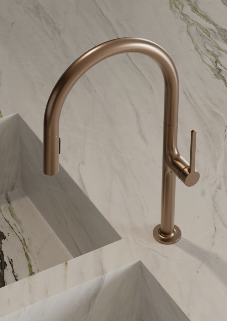 Zudem sind die Armaturen je nach Serie in bis zu sechs stilvollen Farbtönen erhältlich: Chrom, Mattschwarz, Brushed Gold, Brushed Bronze, Brushed Gunmetal und Brushed Nickel. Diese Farbvielfalt ermöglicht eine perfekte Anpassung an unterschiedlichste Küchendesigns.